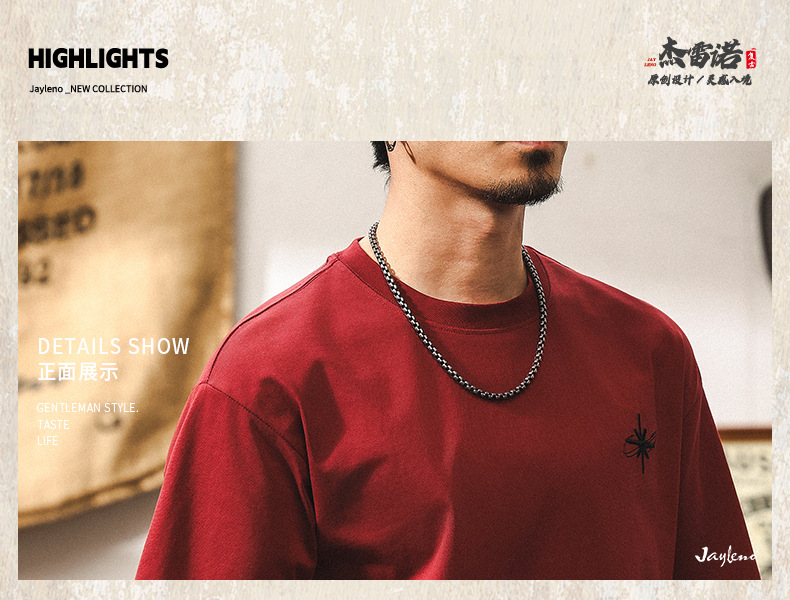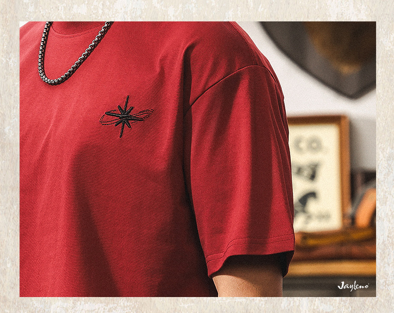 【涼感科技】美式復古簡約刺繡短袖男夏季T恤潮牌寬鬆酒紅色上衣