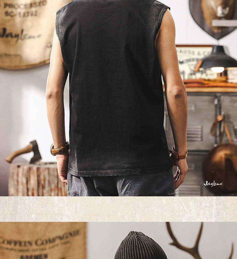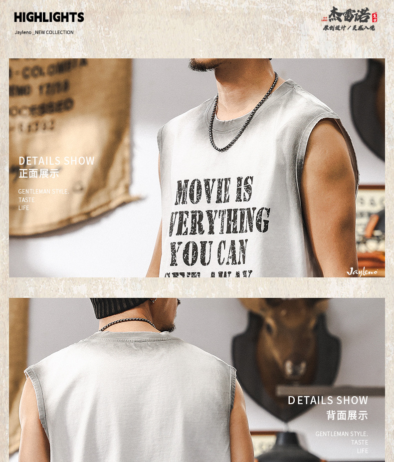 美式復古運動休閒坎肩健身背心男款夏季潮流印花寬鬆無袖男士T恤