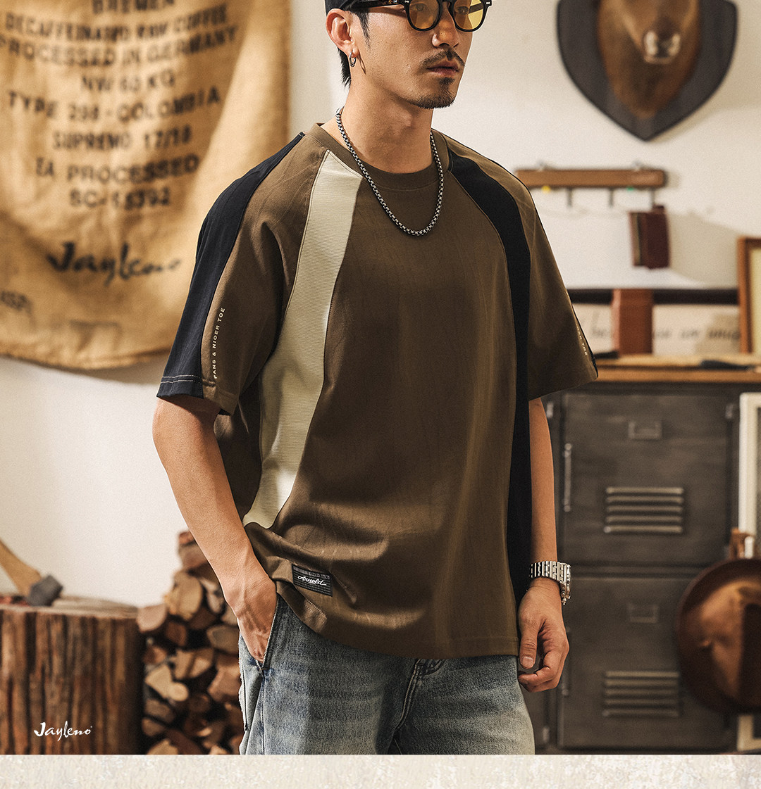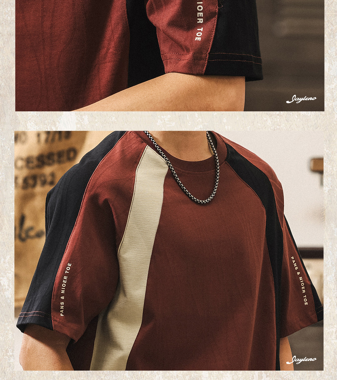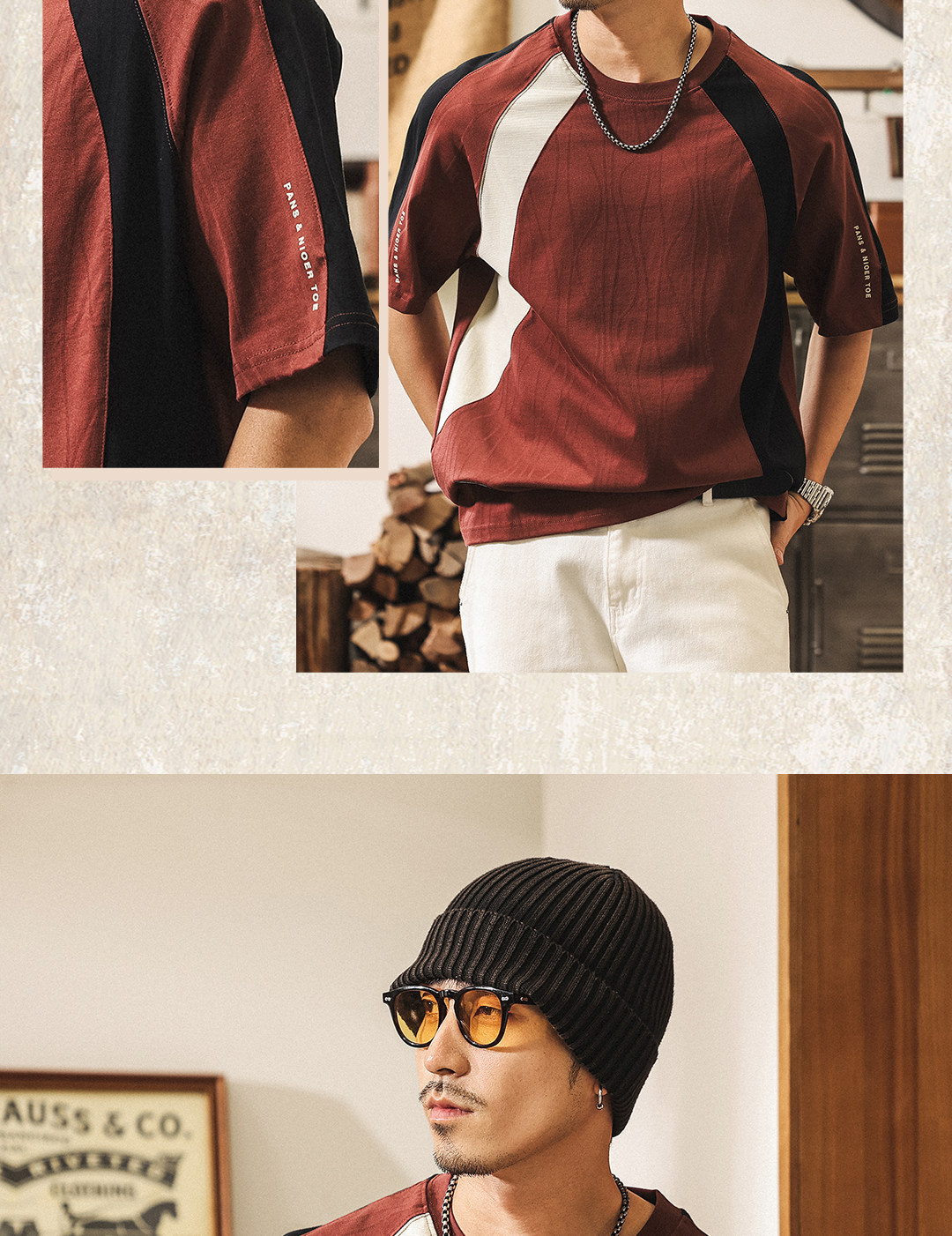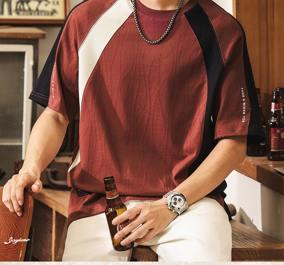 美式復古重磅撞色拼接短袖男T恤夏季潮牌寬鬆酒紅色男裝上衣