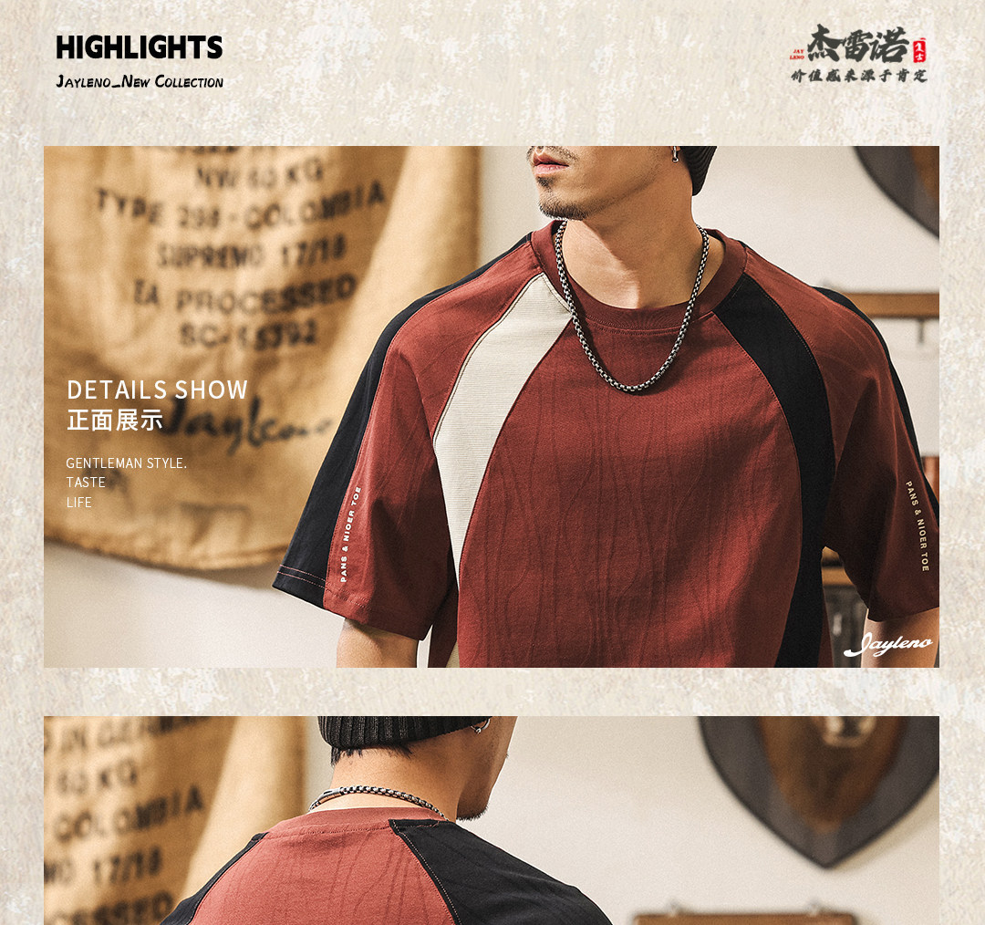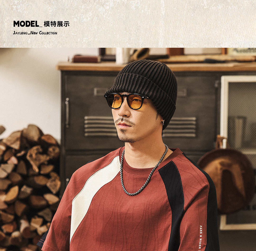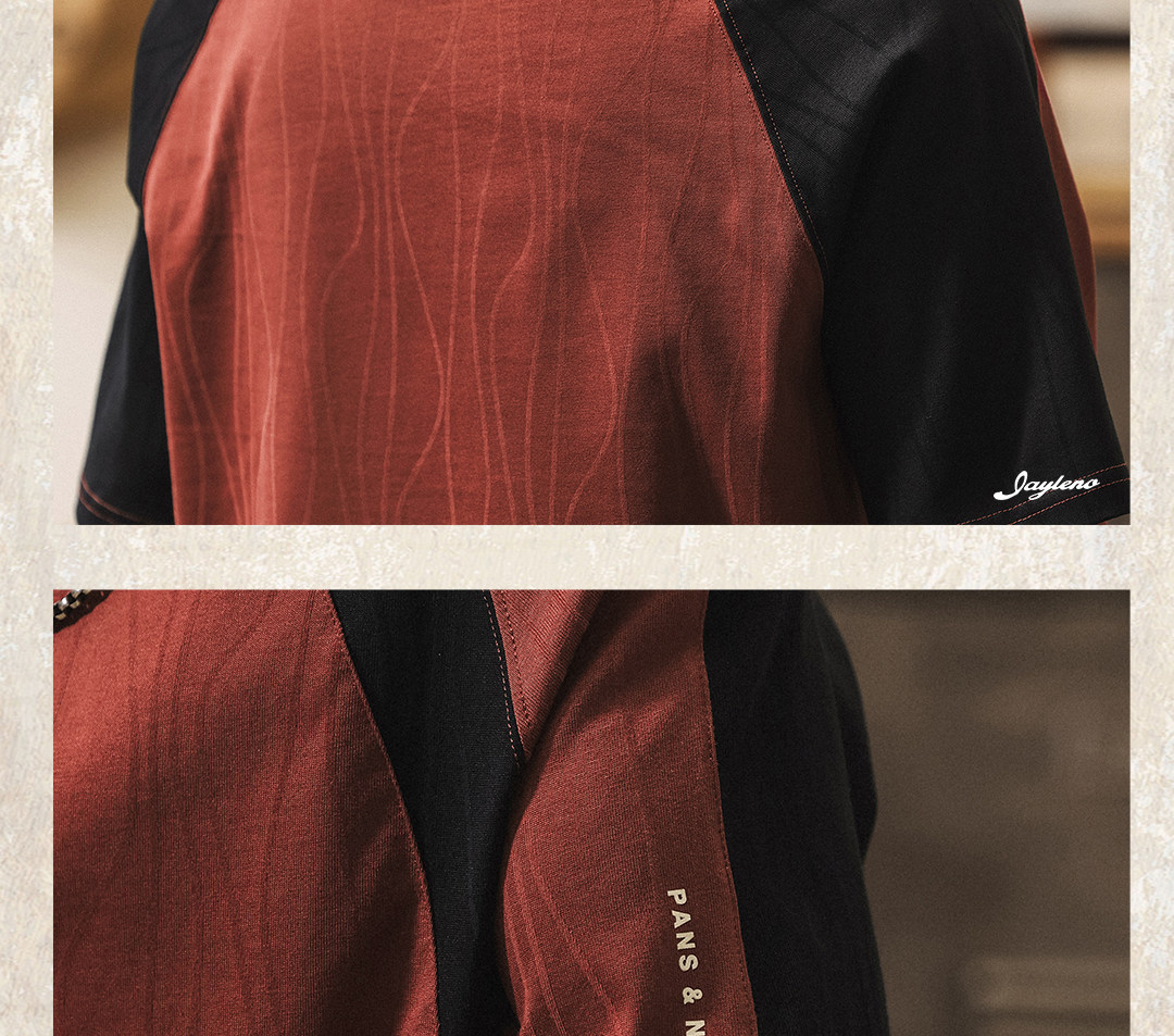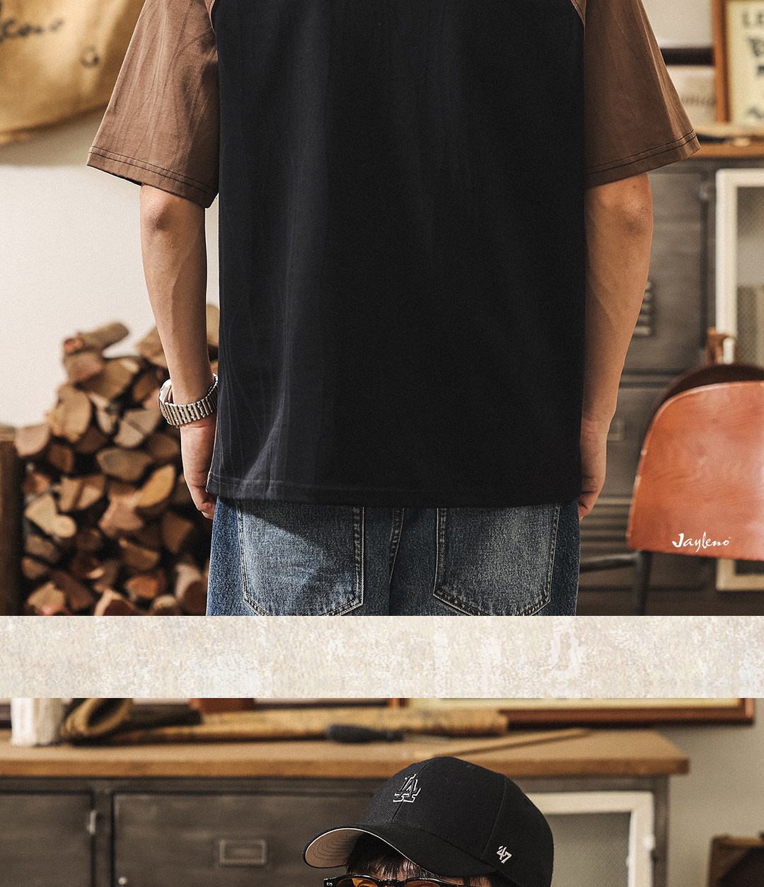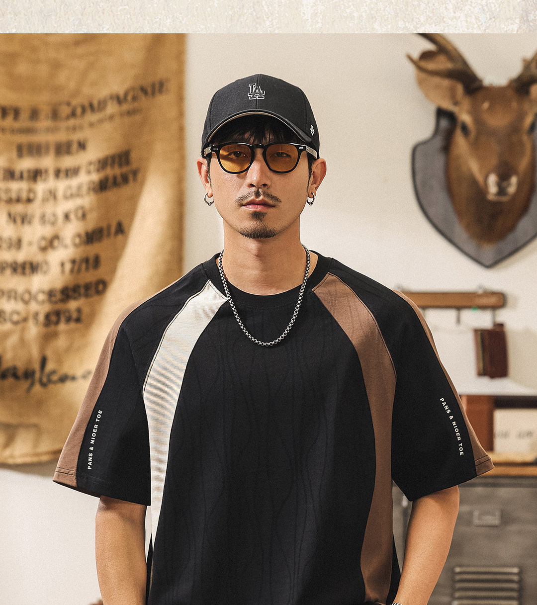 美式復古重磅撞色拼接短袖男T恤夏季潮牌寬鬆酒紅色男裝上衣