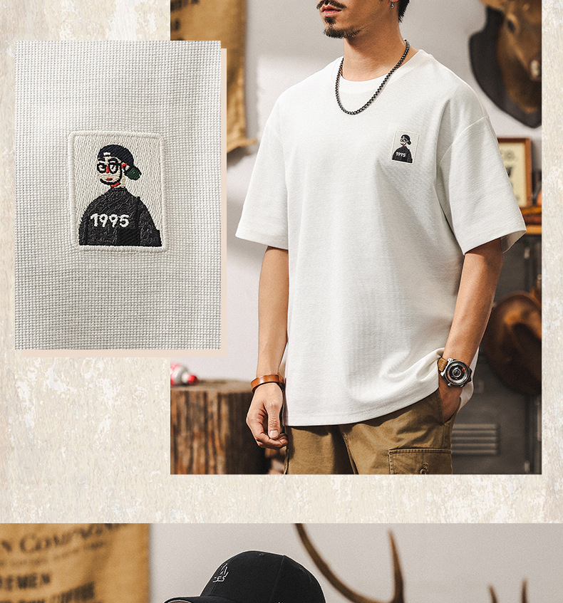 美式復古32支重磅肌理短袖男款T恤夏季寬鬆潮牌簡約刺繡男士上衣