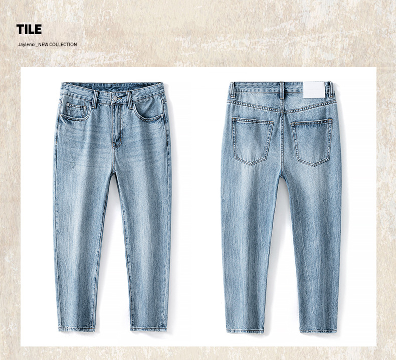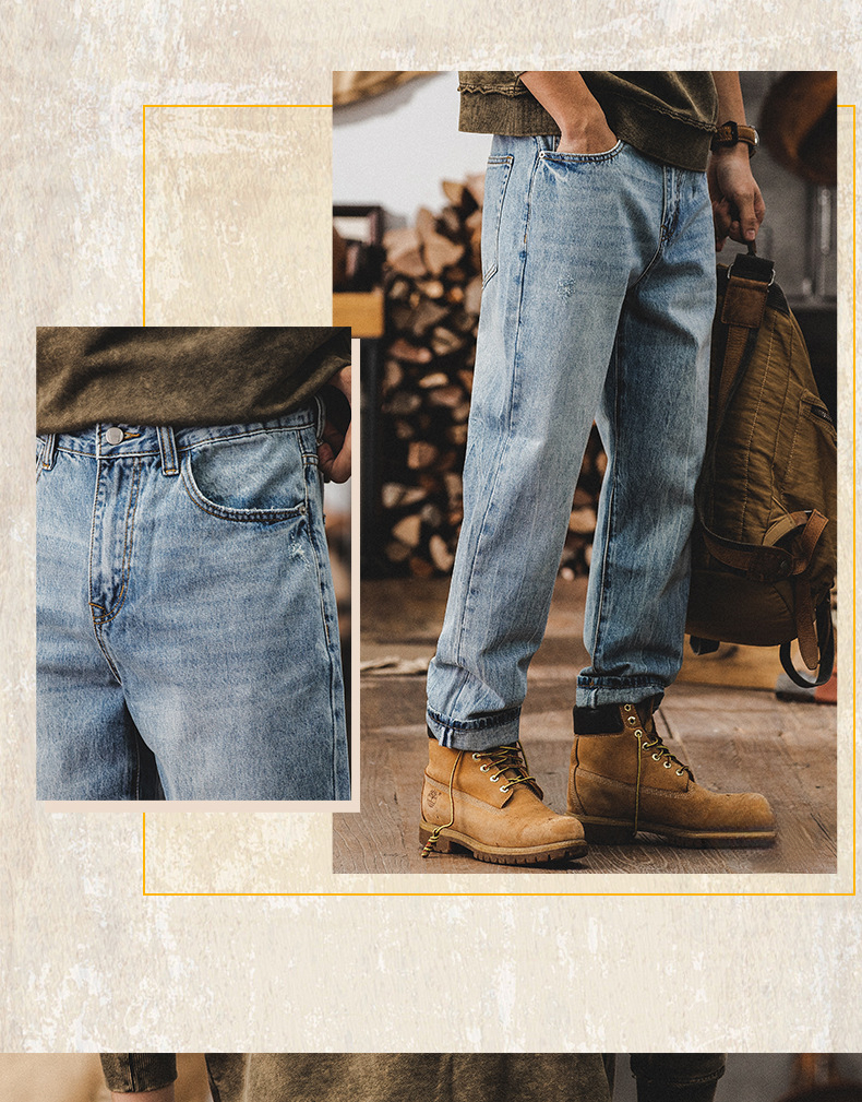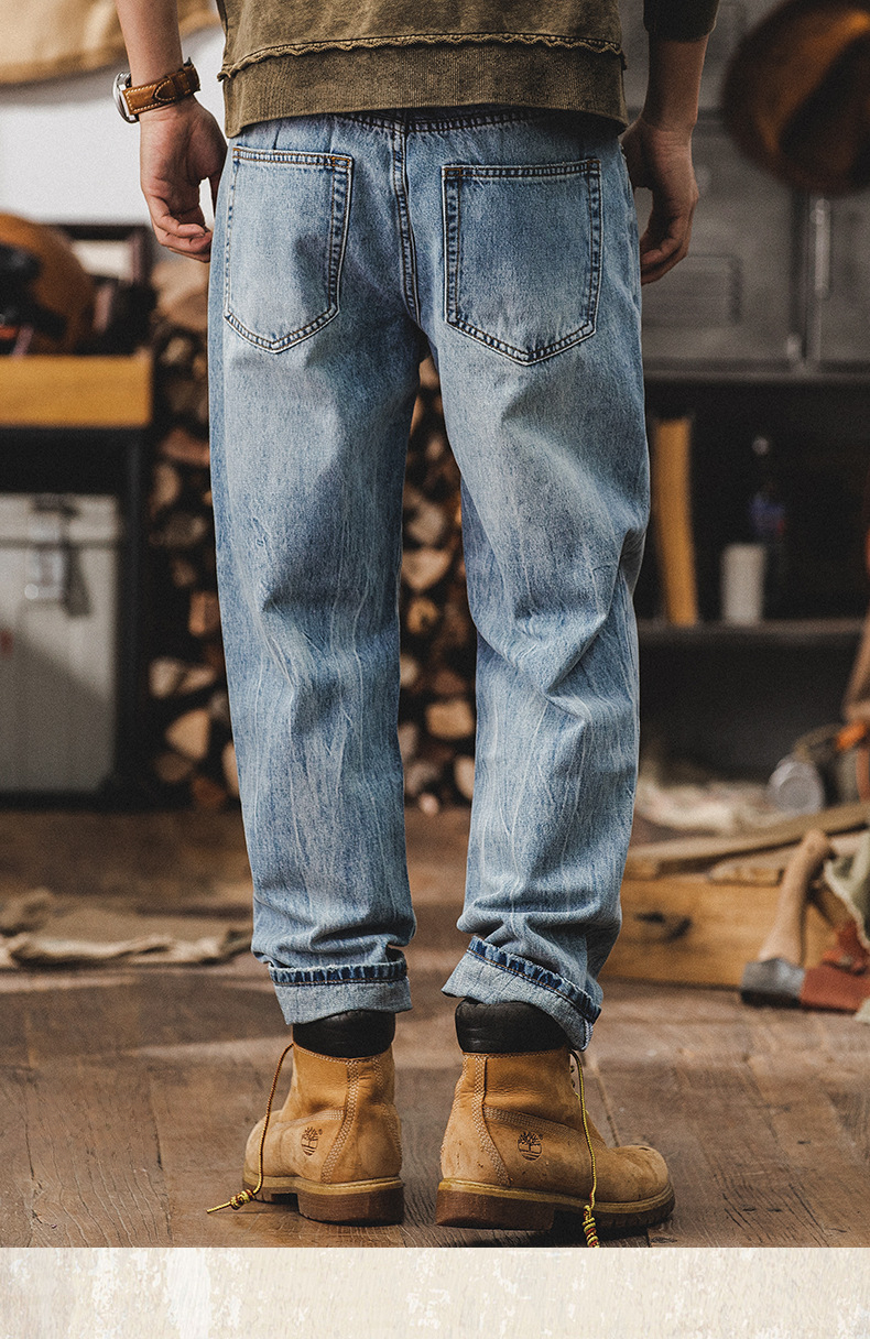 美式經典淺藍色直筒牛仔褲男春季2024新款復古磨白扎花水洗休閒褲