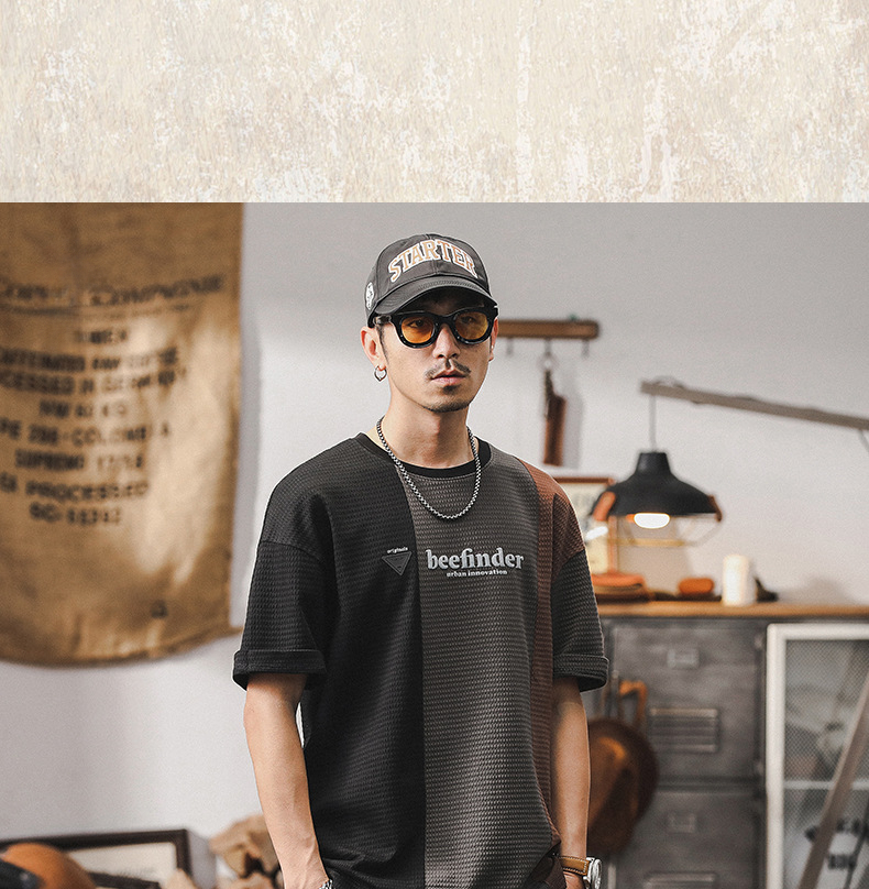美式華夫格短袖T恤男拼接撞色設計款男士體恤夏季寬鬆大碼上衣男