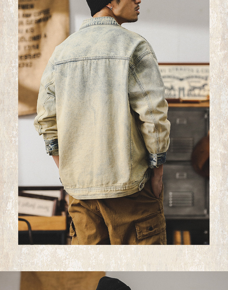 美式重磅复古立领机车夹克男春季痞帅黄泥染做旧赛络纺牛仔外套男
