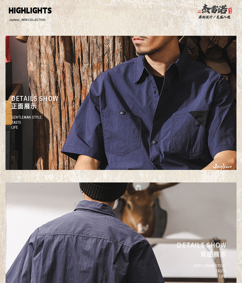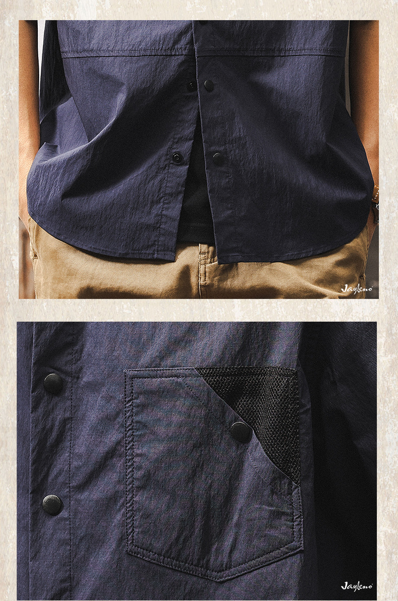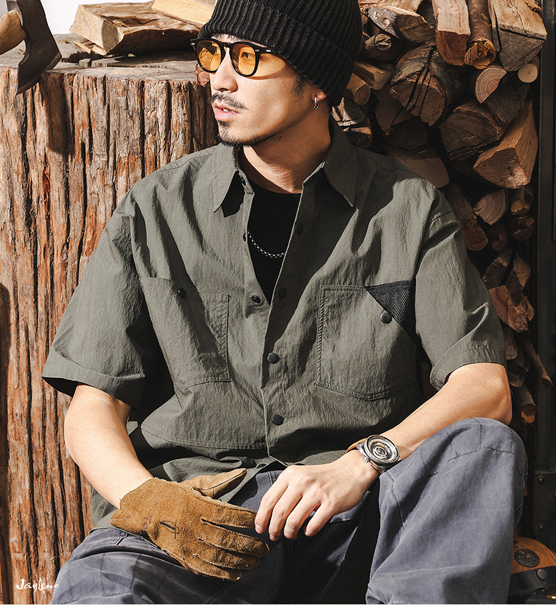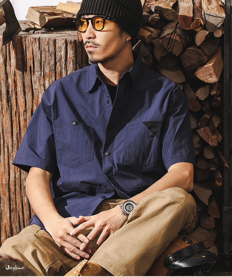 高級感60支棉錦山系戶外短袖襯衫男夏季潮牌美式復古撞色休閒襯衣